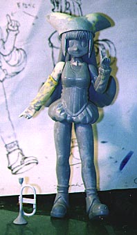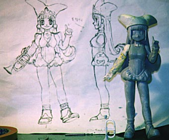 後ろにあるのが原型制作前に描いた二面図スケッチ。 この時点ではまだ、後ろ姿はわからなかった。 99.12/23原型完成