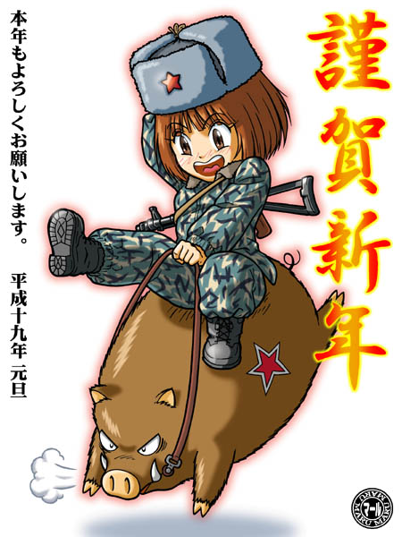 いのししをネタで描くってのは難しいです。 弄り様が無い(汗)。 本当は和服美人でもか着たかったところですけど時間が無くて、こんな物に・・・。 ネット関係の方に配った画像は青系でしたが、元々は緑系のリード迷彩で仕上げていました。 制作時間・10時間位 06.12/24制作