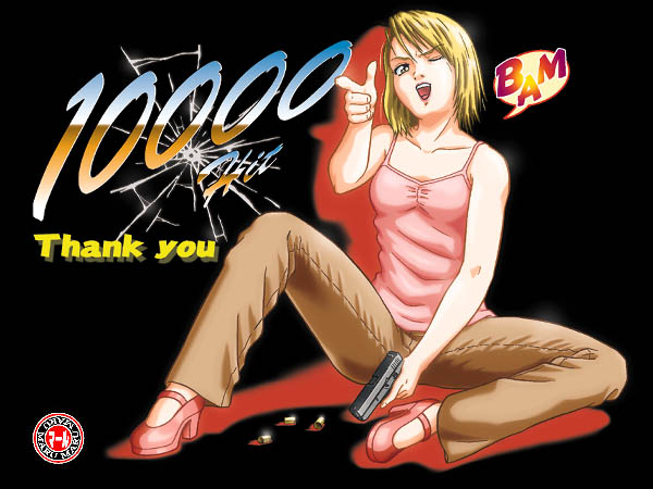 2000.11/7制作 以前から10000HITの時は指で構えているポーズにしようと思っていたので 予定どうりに・・・。 妙に肉付きのいい体型になってしまったのが反省点。 どうも記念イラストを描く時は気負ってしまうようで・・・。